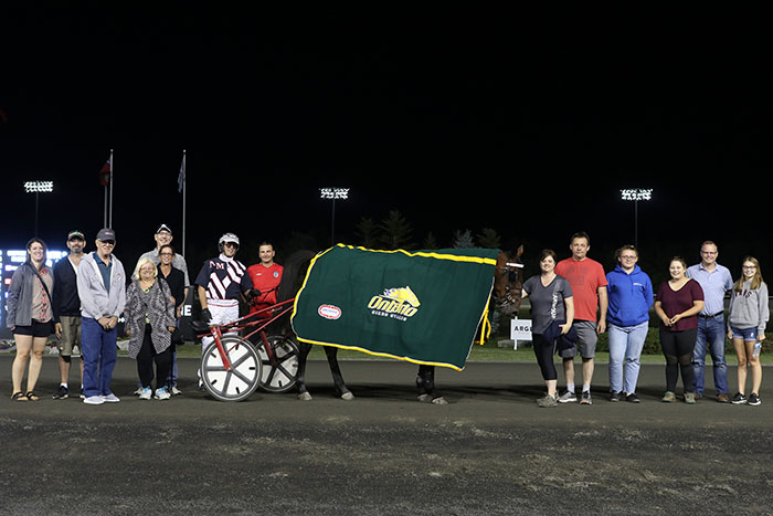 “It was great, we had a gentleman and his two, well kids, but they’re like 45 or so, come by the barn there about two weeks ago. He hadn’t owned a horse in 50 years and he bought the last 15 shares in Hard Eight, and she won tonight and he was in the winner’s circle,” continued the horseman, who operates The Stable in partnership with his wife Amy MacDonald. “He was pretty pumped.”